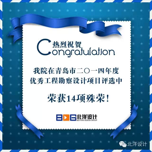 【北洋·喜報】熱烈祝賀我院在“青島市2014年度優(yōu)秀工程勘察設(shè)計項目”評選中獲得多項殊榮!